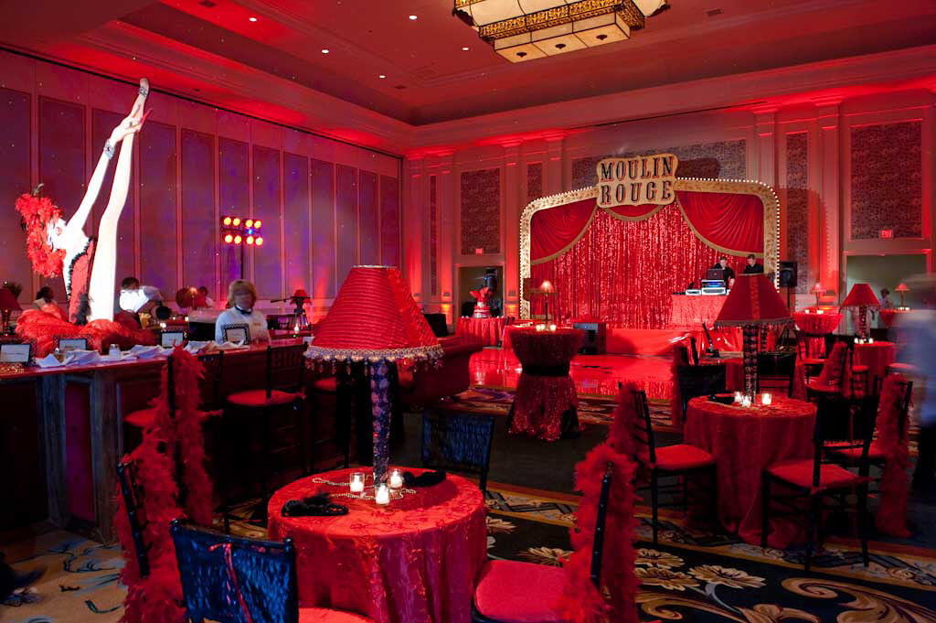 Moulin Rouge, is another one our favorite theme décor ideas for your gala or your black tie event. Moulin Rouge is a cabaret in Paris, France, known for their ballroom dancing, impressive costumes and theatrical floor acts. This theme uses a deep red and black color scheme base with a lots of overhead lighting fixtures to illuminate the floor. In this case using amber or so called white lights will work best in adding ambiance to your venue. Event if your venue is simple, using up lighting will transform it from plain to amazing. Also choosing a venue or a party room with a nice stage is also important for a live act or dance performers as a form of entertainment for the whole Moulin Rouge theme experience. Transporting your audience, guests to 1889 Paris Olympia. Having a red carpet entrance is a great start. It welcomes your guests and they anticipate the surprise. Entrance to your elegant should be draped in red velour Austrian Drape. The table cloth and linens can be a combination of red and black linens as well as napkins accenting the table top décor. Considering only the two colors red and black can be challenging, feel free to add a third color, for instance a gold or a silver to you themed décor. Even hot pink and purple can add an extra “POP” to your venue.