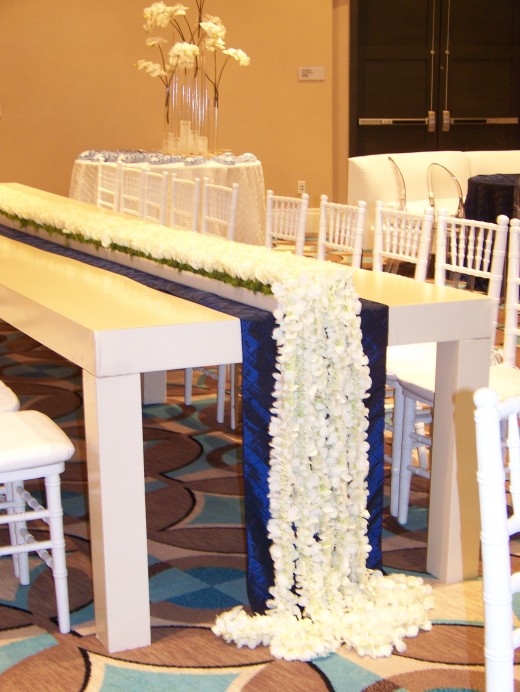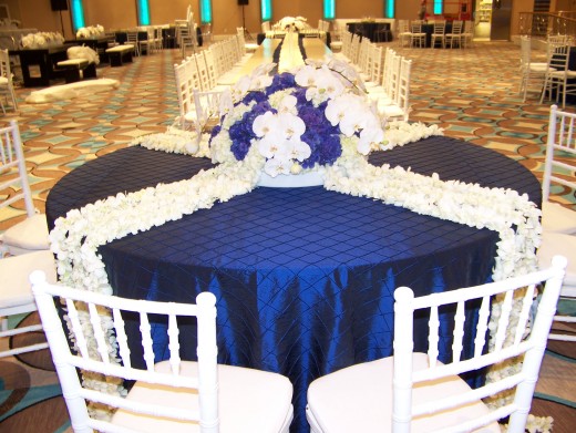 Winter wonderland is a great theme. It does not have to be winter. The magical blue with a hint of white is perfect match to take you to never land. iDesign Events carried a variety of taffeta and satins for your table cloth and linen choices. Event the polyester royal blue linen and table cloth will make the winter wonderland theme pop. As for flowers, iDesign Events carries a variety of silk arrangements for rent as well as their in house florist can provide those fresh arrangements for your centerpieces. As nationally noted on average wedding flowers are around 2200 in cost of your budget. Therefore going for half fresh large arrangements and half floating or submerses in water flowers, might be a great option and of great help for your budget. Delivery and set up is available for an additional fee.